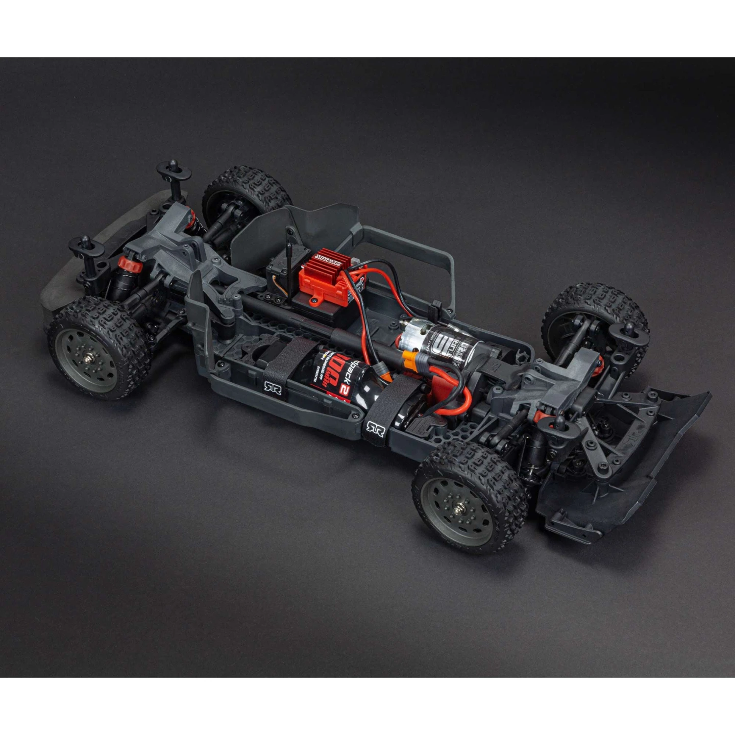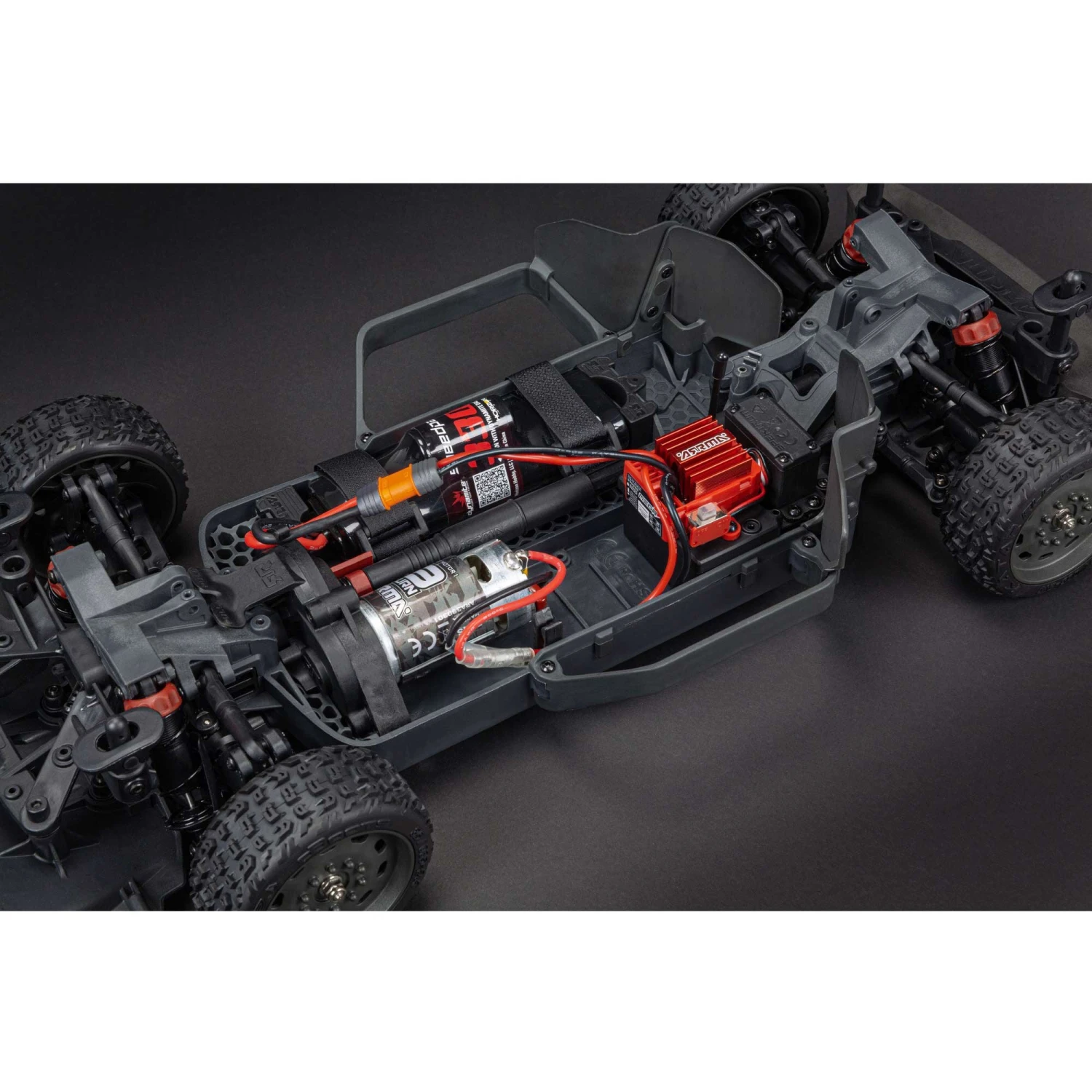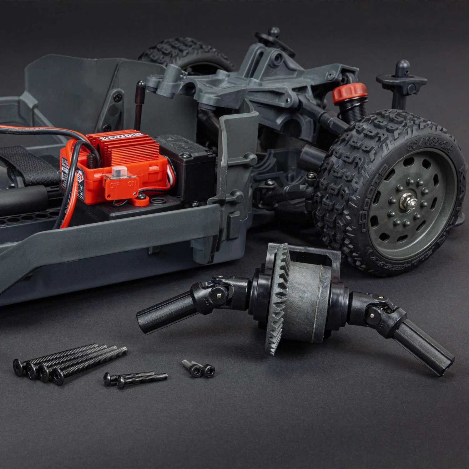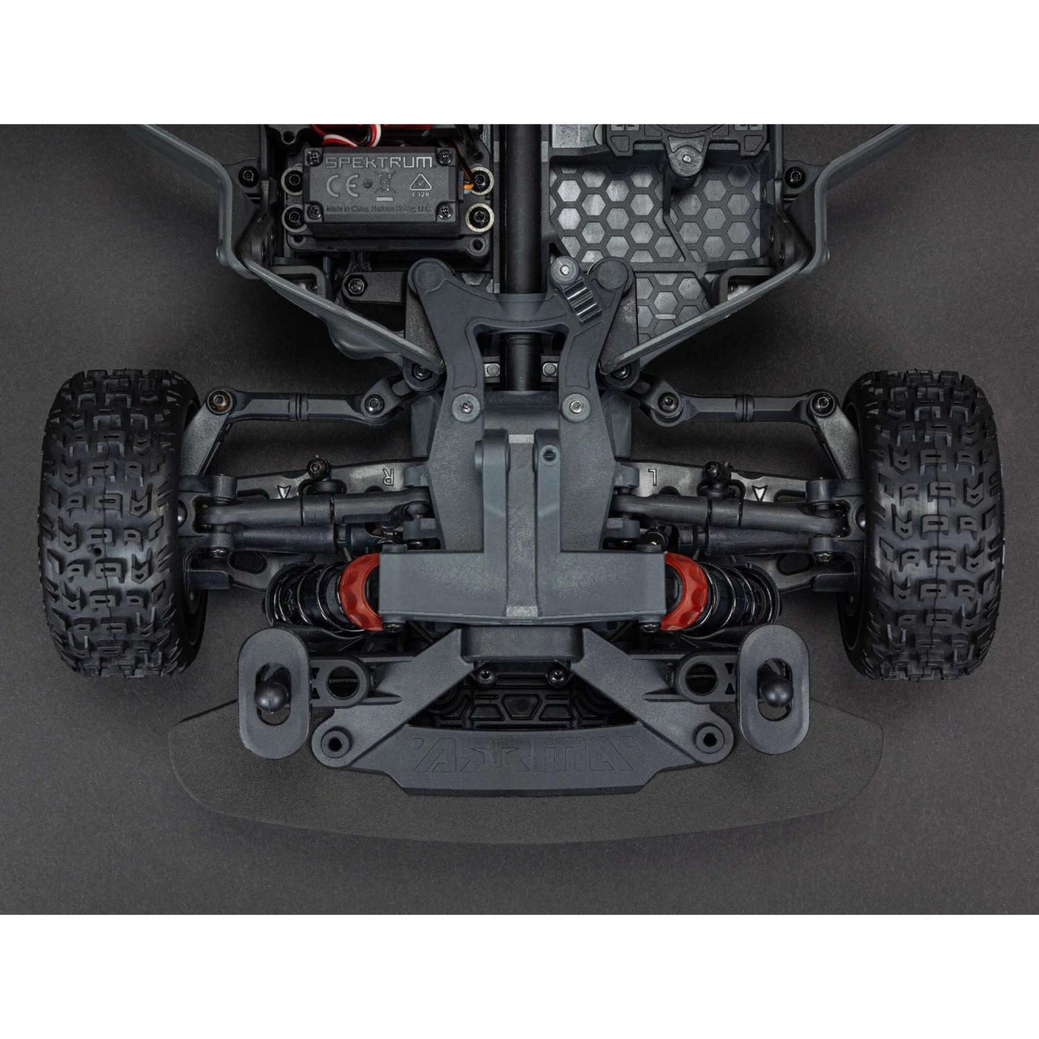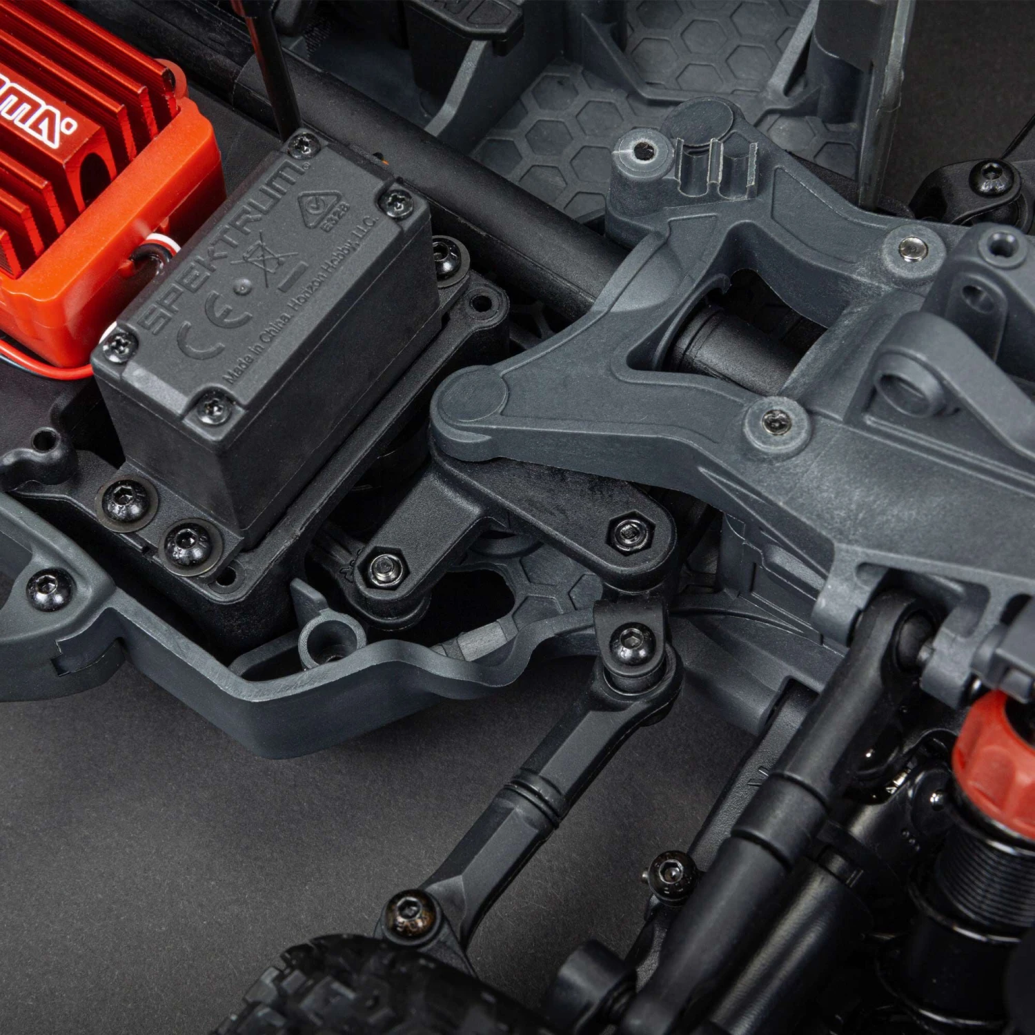 For precise, dependable control, ARRMA® engineers have outfitted this RTR with the 2.4GHz Spektrum™ SLT3™ transmitter and SLR300 receiver. The transmitter is ergonomically designed for long periods of fatigue-free bashing and has a foam wheel for precise fingertip control plus an improved hand grip and trigger feel. New drivers will be able to set throttle limits at 50% or 75% until ready to use the full speed potential. The SLT3™ is compatible with Tactic® SLT™ receivers to run other RTR vehicles you may own, and it includes a third channel to control optional features such as lights and winches on models that have them.
