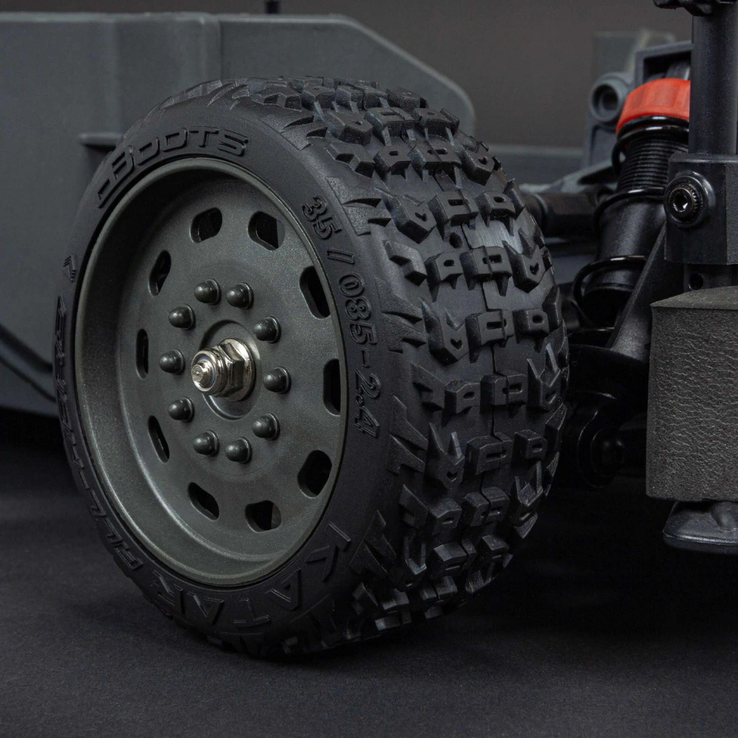 The INFRACTION® 4X4 MEGA Street Bash Resto-Mod Truck is equipped with a powerful MEGA 9T brushed 570 motor and brushless-ready transmission. With an optional pinion gear (not included), it is capable of 30+ mph speeds under optimal conditions. The dBoots® Katar vented all-road tires are made of high-quality rubber for long-lasting durability and provide incredible traction in all surface conditions. The tires are glued to tough, gun-metal colored nylon wheels and include high-quality inserts for excellent tread support.