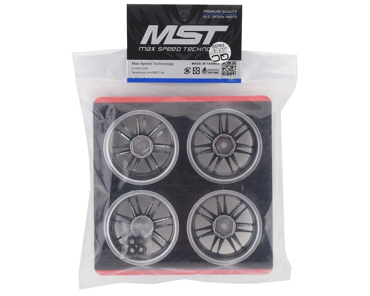 MST RE30 Wheel Set. These wheels offer a +10mm offset increase and feature a 14 spoke design with molded in bolt details that will look great on any drift car. Package includes four wheels and four wheel nuts.