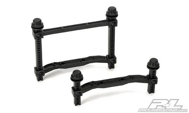 This is an Extended Body Mount Kit with Secure-Loc Caps for the Slash 4×4®. Pro-Line continues to innovate with more must-have accessories for your Short Course Truck. The all-new Pro-Line body mount kit includes adjustable body mounts so you can fit any body on your truck perfectly, including Rally car bodies! But, the Pro-Line Engineers did not stop there. Instead of just using the same old flimsy body clips that always get lost and bent up, the Pro-Line Extended Body Mount kit includes a revolutionary screw on body mounting system for a strong and secure mount every time. No more getting stabbed in the finger by those nasty clips! Just screw down the included setscrew into the body mount, place the O-Ring over the setscrew and mount your body as you normally would, but with the added safety, security and styling of Pro-Line’s innovative screw on body mounting system! Get your Extended Body Mount Kit today!