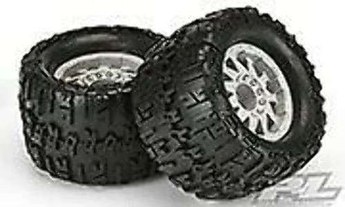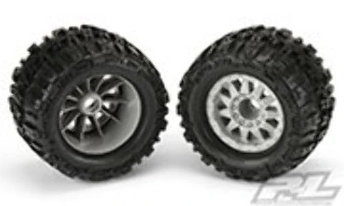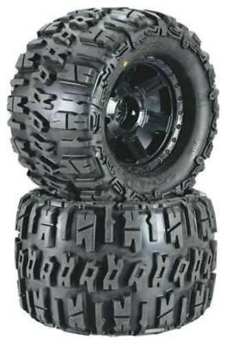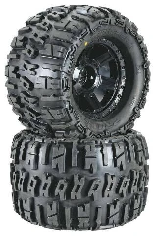 This is a pair of pre-mounted Trencher X 3.8″ All Terrain Tires. Leave a mark with your Monster Truck wherever you are with Pro-Line’s Trencher X tires. The Trencher X tires are designed to give your MT optimal traction on just about any surface. Super cool horizontal H-shaped treads give your MT ridiculous amounts of forward bite. With tread height at ?” tall, you”ll find that durability and longevity are second to none. “The tires provide more stability and tons more traction on any surface, in turn they make a monster truck unstoppable. When using the tires on gravel or any other loose surface they grip enough to keep you from spinning out but still allow you to slide, to drift or do donuts. The traction that the tires provide is really the best of both worlds and seems to be made for bashing. But when they are taken out on a track they perform like a tire that’s made for racing! They handle clay surprisingly well the tires were sticking to the corners and helping me rip wheelies down the straight away..” BigSquidRC.com