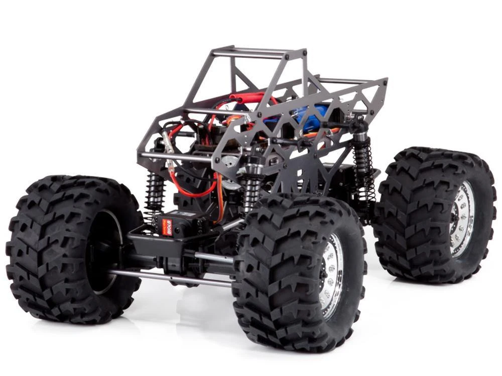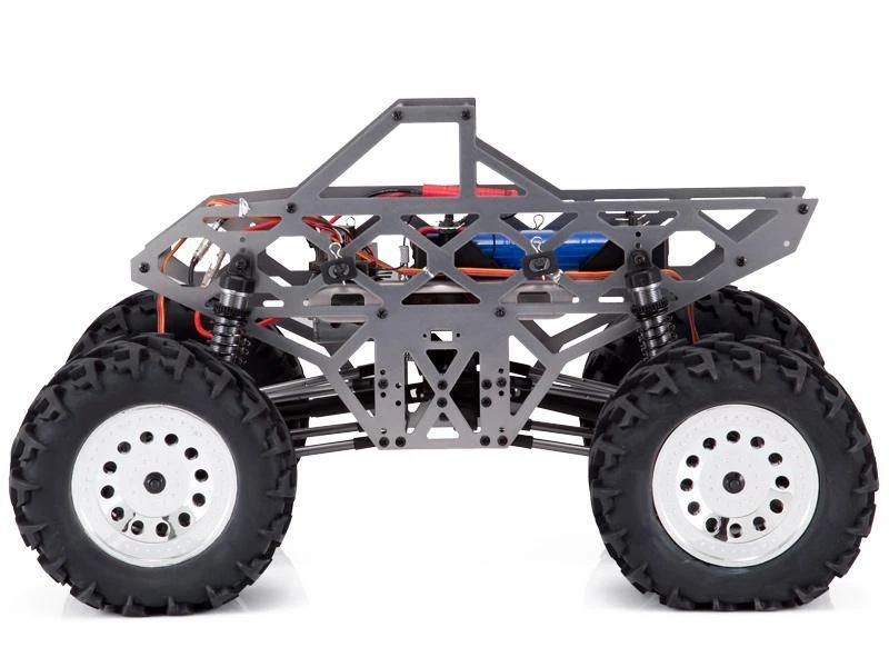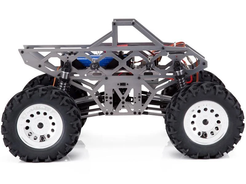 - Shaft driven monster truck, Solid axle 4 Wheel drive, 4 link suspension, 4-mode 4 Wheel steering, 2 Steering servos, 3-channel 2.4GHz radio, Aluminum “tube style” chassis, Oil filled shocks, Ball bearings throughout.