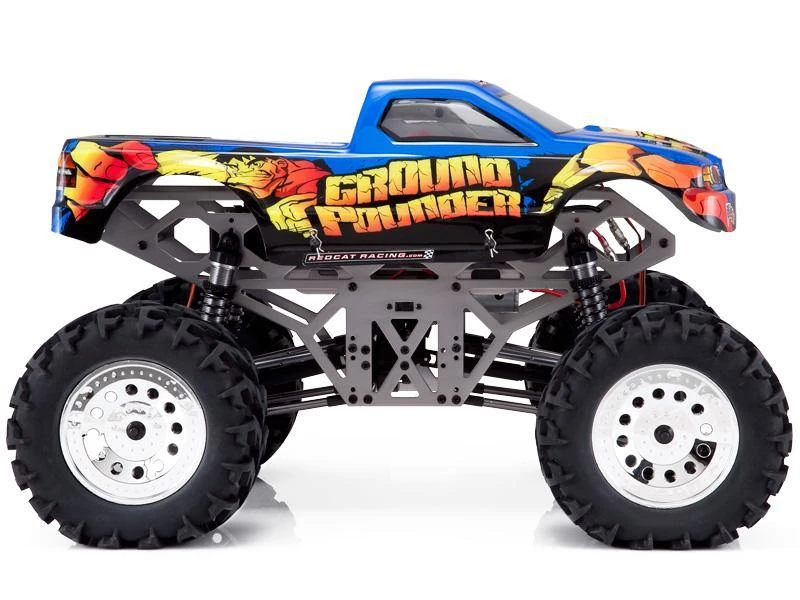 With a beautifully styled body, aluminum “tube style” frame, mid motor shaft driven 4WD, solid axles, four link suspension, and aluminum threaded body oil filled coil-over shocks, you won’t know whether to display the Ground Pounder on a shelf or get it dirty in the yard. This 1:10th scale monster truck was designed to look and perform like the real thing.