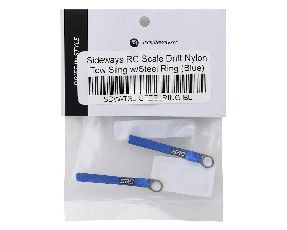 This is a set of Sideways RC Blue Nylon Tow Straps with Steel Ring, ideal scale option parts to add realism to any 1/10 drift kit. These fabric tow straps are handmade with the colors infused directly into the product in multiple pigment options. These straps include a steel circle ring shaped tow hook and add a high level of detail to any drift application.